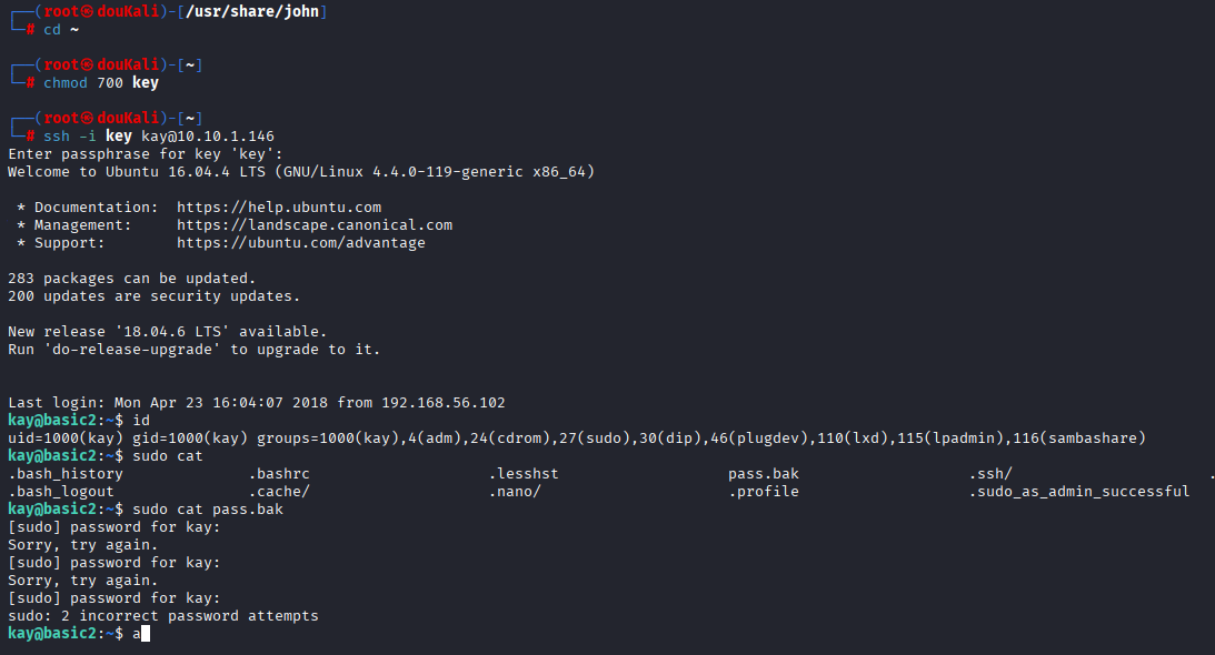 ssh -i key kay@10.10.1.146密码输入后进入kay用户,什么id搞一遍看看用户组,但是还是没办法使用root,也不是登录密码sudo,只能看看文件可否查询