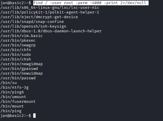find / -user root -perm -4000 -print 2>/dev/null